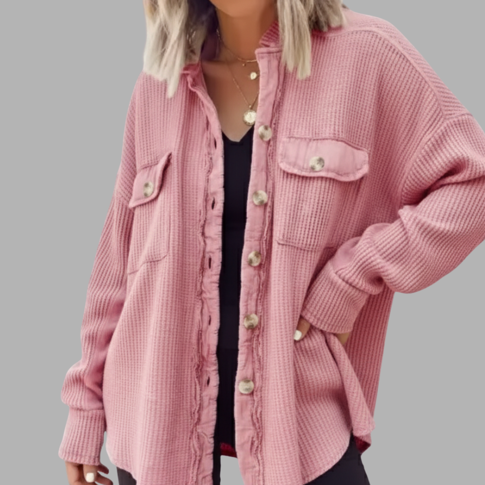 Confectionnée dans un tissu velours finement côtelé, elle procure une agréable sensation de chaleur et de légèreté. Parfaite pour la mi-saison, elle se porte aussi bien ouverte sur un top que fermée pour un look plus structuré.